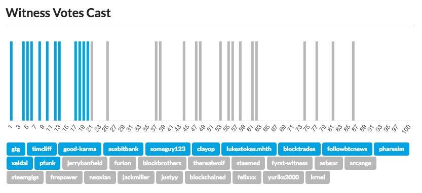 증인들이 누구에게 보팅했는지 보여주는 차트입니다. 아래의 숫자는 순위입니다. 보통 1위부터 20위쪽에 많이 보팅하지만, 많은 증인들이 하위 증인들에게도 보팅하고 있습니다. 하위증인중에서 보팅을 많이 받아 상위로 올라오면 이 차트는 결국 또 왼쪽으로 쏠리게 됩니다. 따라서 결국 왼쪽에 더많이 보팅이 될 수 밖에 없는 구조입니다. 그러나 모든 증인들은 자신의 보팅을 자주 점검하고, 열정있는 하위 증인들에게 보팅을 옮겨줄 필요가 있다고 생각합니다.