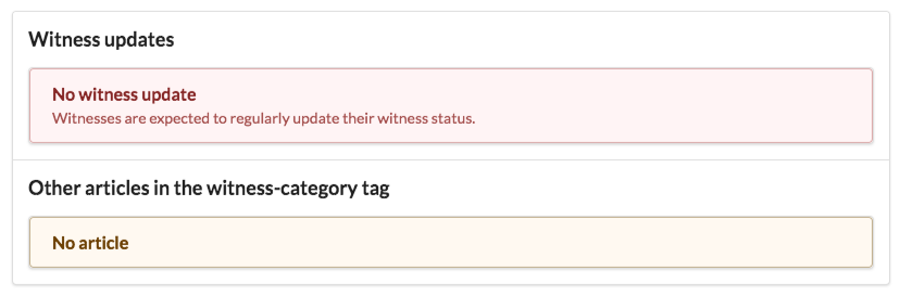 증인들은 증인 업데이트 글을 통하여 무슨 활동을 하고있는지, 문제는 없는지, 문제가 있었다면 원인이 뭐였으며 어떻게 대처 했는지 등의 정보를 공유합니다. 한달에 한번 정도는 업데이트 할 필요가 있다고 생각하며, 업데이트는 따로 없더라도 witness-category에서 활동하는 모습이 보여야 한다고 생각합니다.