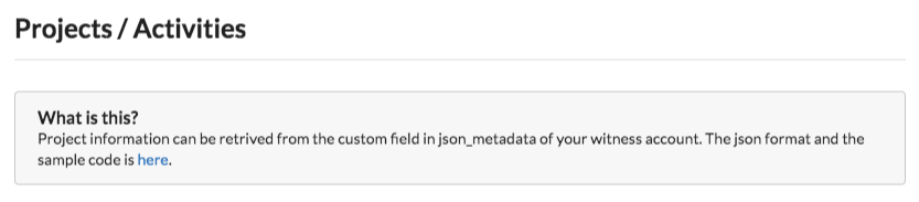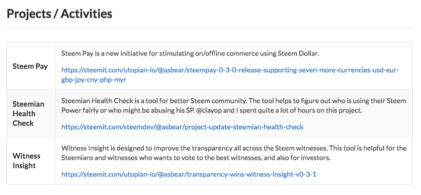 증인들이 수행하고 있는 프로젝트를 통해서 사람들은 어떤 증인을 지지할지 결정하고 응원할 수 있습니다. 현재 이러한것들을 확인하는것은 엄청난 시간을 소모합니다. 이는 증인들에게도 마찬가지입니다. 자신들이 어떤 일을 하고 있는지 일목요연하게 보여줄 수 있는 방법이 없습니다. 스팀 인사이트는 증인들이 직접 프로젝트 목록을 등록 하면 이를 보여주도록 하는 기능이 있습니다.