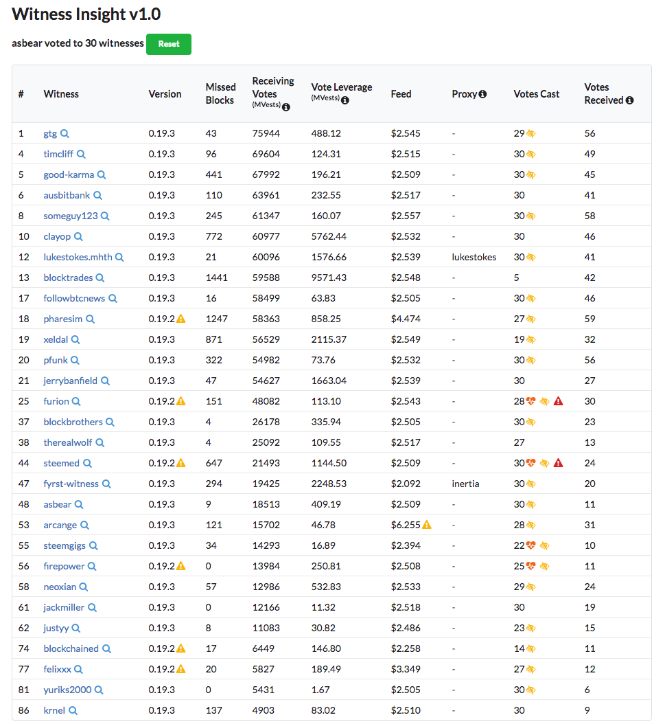 제가 투표한 증인들도 몇명은 활동 중단한 증인들에게 투표하고있고, 몇명은 0.19.1 을 사용중인 증인에게 투표하고 있는것을 한눈에 알 수 있습니다. 이 툴을 공개한 후에도 저 증인들이 자신들의 보팅을 재정비 하지 않는다면 보팅을 취소할 계획입니다.