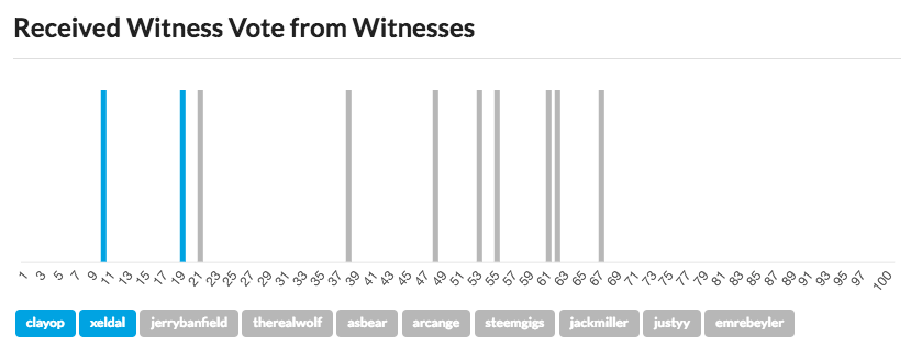 이 차트는 어떤 증인들로부터 보팅을 받고있는지를 보여줍니다. 이 차트 자체로는 별 의미가 없습니다. 그러나 간접적인 영향을 유추 해 볼 수 있습니다. 여러 증인들로부터 골고루 보팅을 받고있는지, 하위 증인들에게만 인기가 있는지, 상위 증인들에게서만 받고있는지 등입니다.