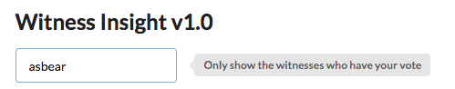 모든 증인을 보는 기능은 물론 가장 중요하지만, 내가 선택한 증인들의 상태를 집중적으로 볼 필요가 있습니다. 전에는 분명 건강한 증인이었는데 시간이 지나면 문제가 생길 수 있기 때문입니다. 스팀 인사이트는 이 기능을 지원합니다. 다음과 같이 본인의 계정을 입력하면, 본인이 투표한 증인들만 보여줍니다.
