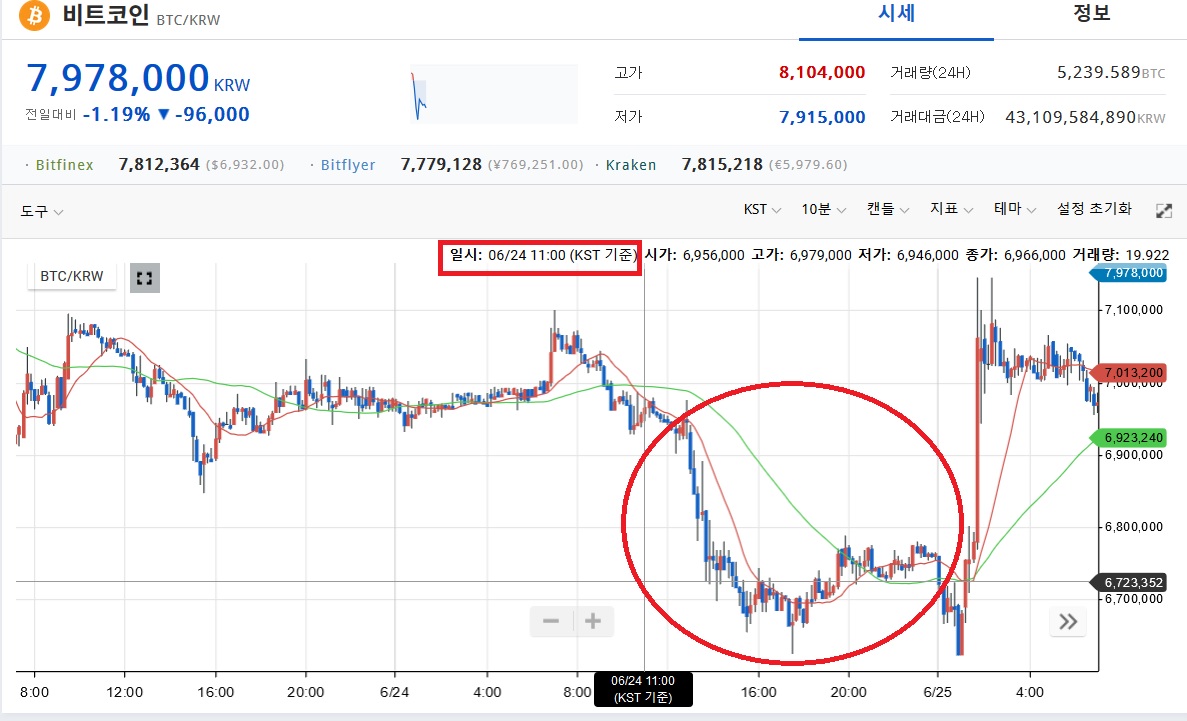 그래서 저는 당시 비트코인은 마음 편히 3시간도 보유하고 있으면 안될 정도로 위험한 대상이다 라고 느꼈습니다. 물론 다음날 다시 원래 가격 수준으로 급격히 반등이 이루어지긴 했지만 고작 3시간만에 저러한 변동성을 보였다는게 중요합니다.