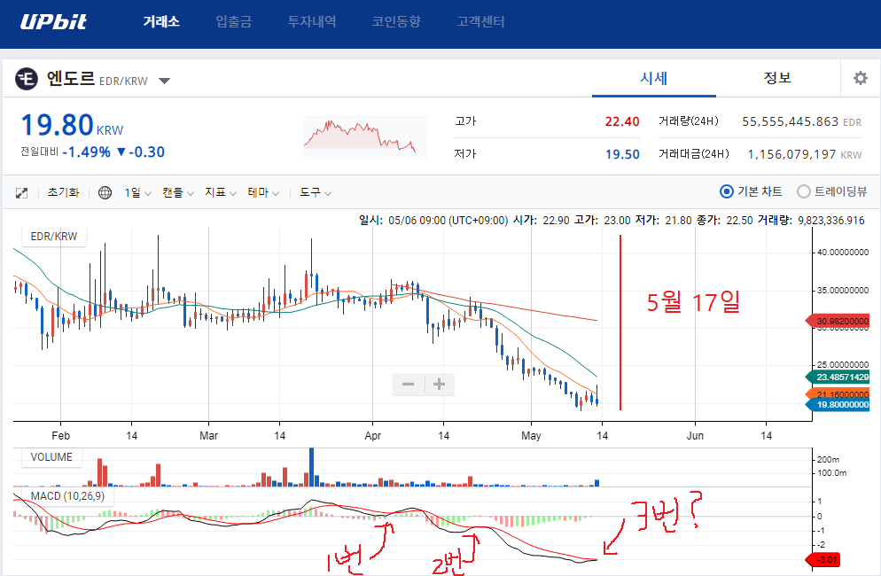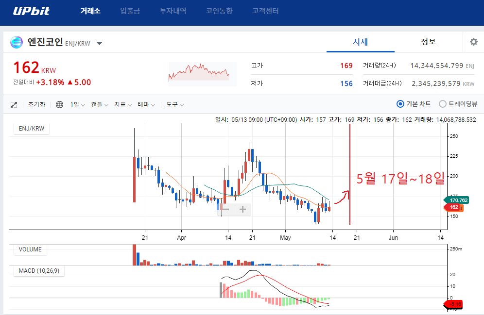 그리고나서 5월 18~19일쯤 큰 변화가 예상되며 이 변화에서 상승을 하게되면 195원~200원정도까지 오를 것으로 보이며, 반대로 하락을 하게되면 140원대까지 갈 것으로 예상됩니다.