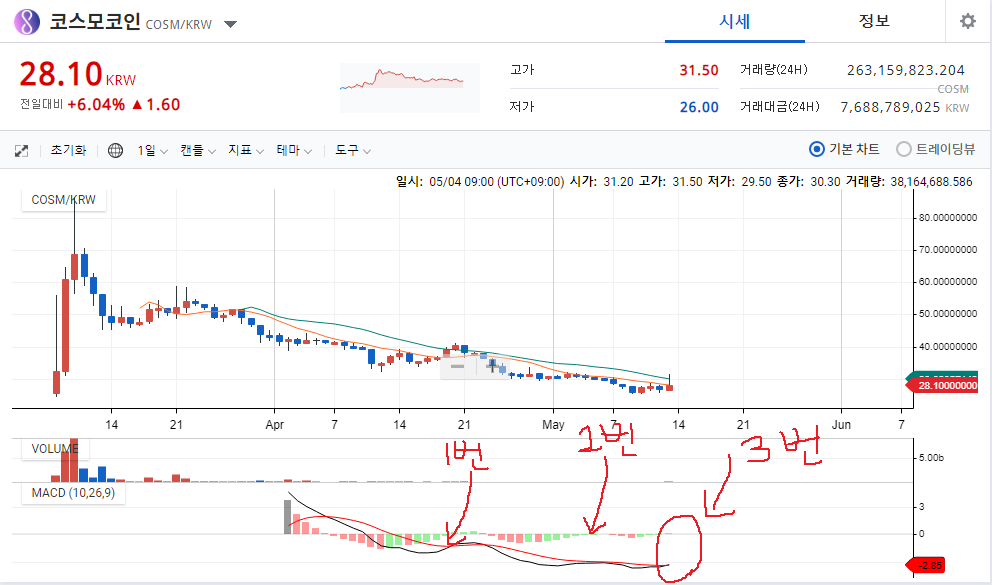 코스모코인 1일 차트를 보게 되면 2019년 3월 28일 10일선과 21일선이 크로스되며 본격적인 하락을 시작해서 현재까지 총 2번의 상승 도전 때 실패하면서 "힝~속았지?" 가 나온 상태입니다. (힝~속았지? 란 상승 할 것 처럼 하면서 실패한 경우를 말합니다)