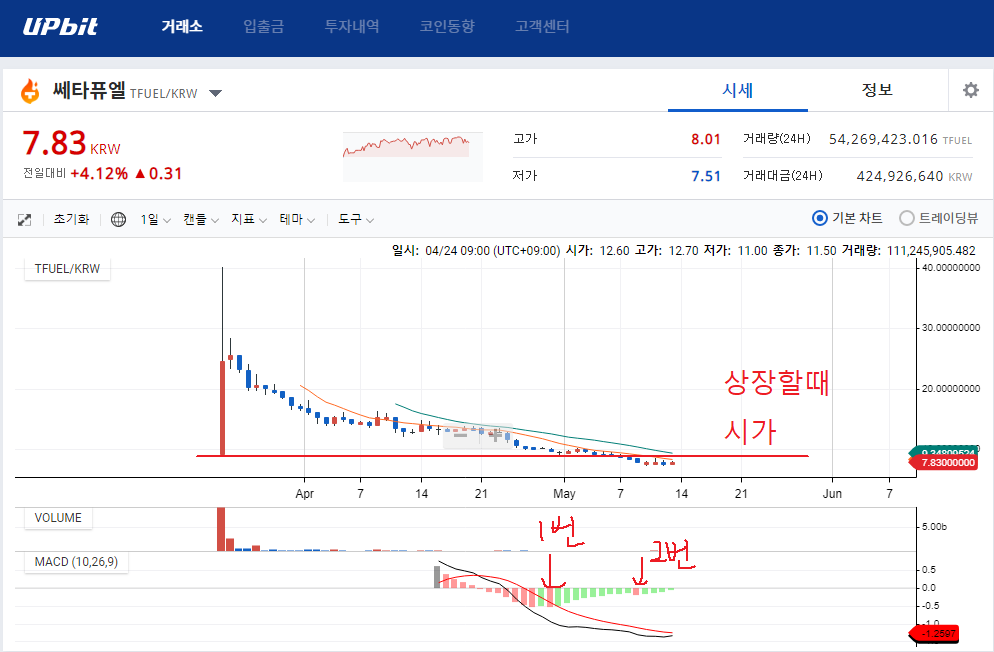 쎄타퓨엘의 경우 현재 가격이 상장할때 시가보다 낮은 상태이고, 2번의 상승 도전에서 다 실패했었기 때문에 이번 상승 도전은 성공할 확률이 높아보입니다.
