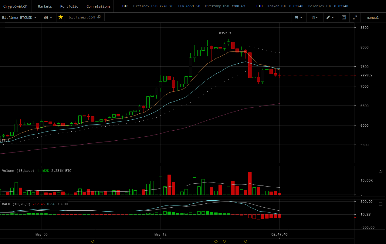 6시간 차트를 봤을 때 내일 저녁 시간대부터 본격적인 상승해서 5월 21일에는 7,700$~7,800$ 를 찍을 가능성이 높아보입니다. 7,700~7,800$ 찍고나면 다시 조금 하락해서 7,500$ 쯤에서 횡보가 예상됩니다.