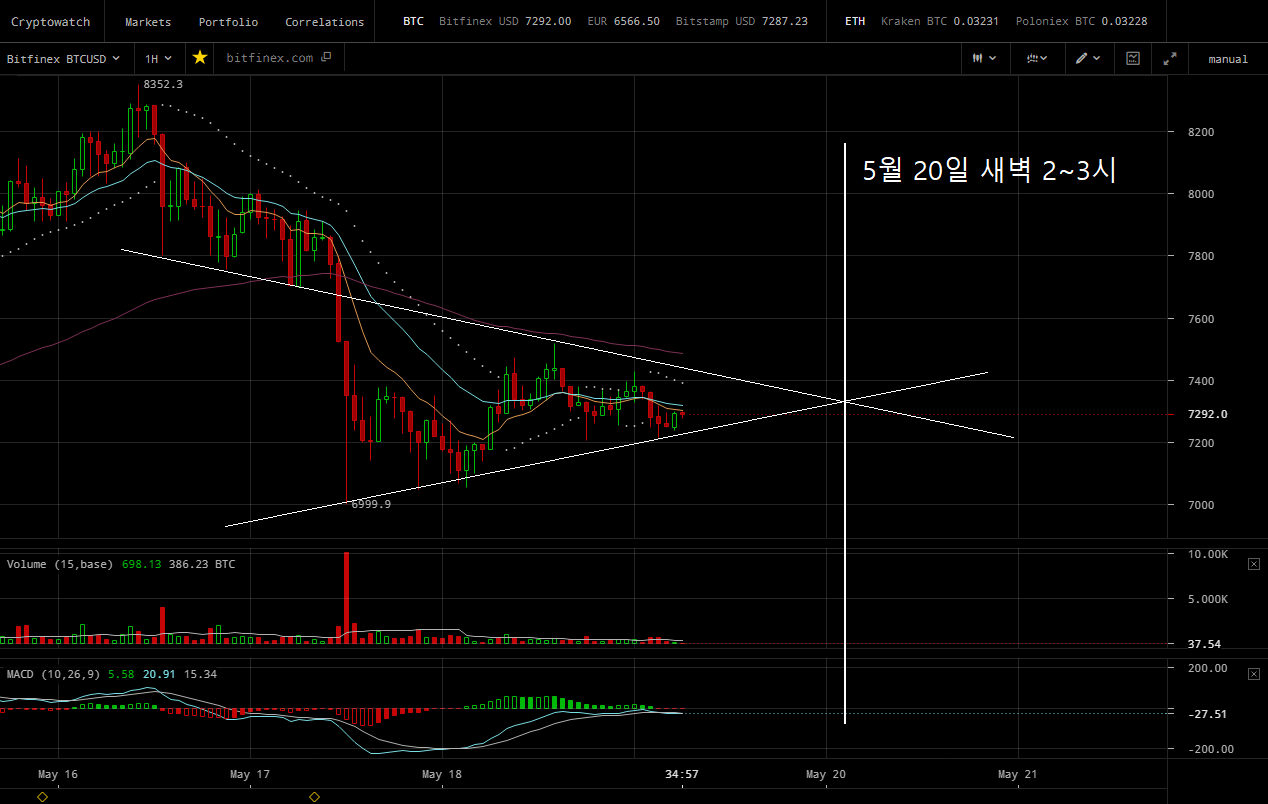 1시간 차트를 보면 완연한 횡보인것을 알 수 있습니다. 조만간 수렴하면서 위로 갈지 아래로 갈지 방향이 정해지게 됩니다. 5월 20일 새벽 2~3시쯤 변화에 따라 앞서 위에서 예상한 모든 것이 정해지게 됩니다.
