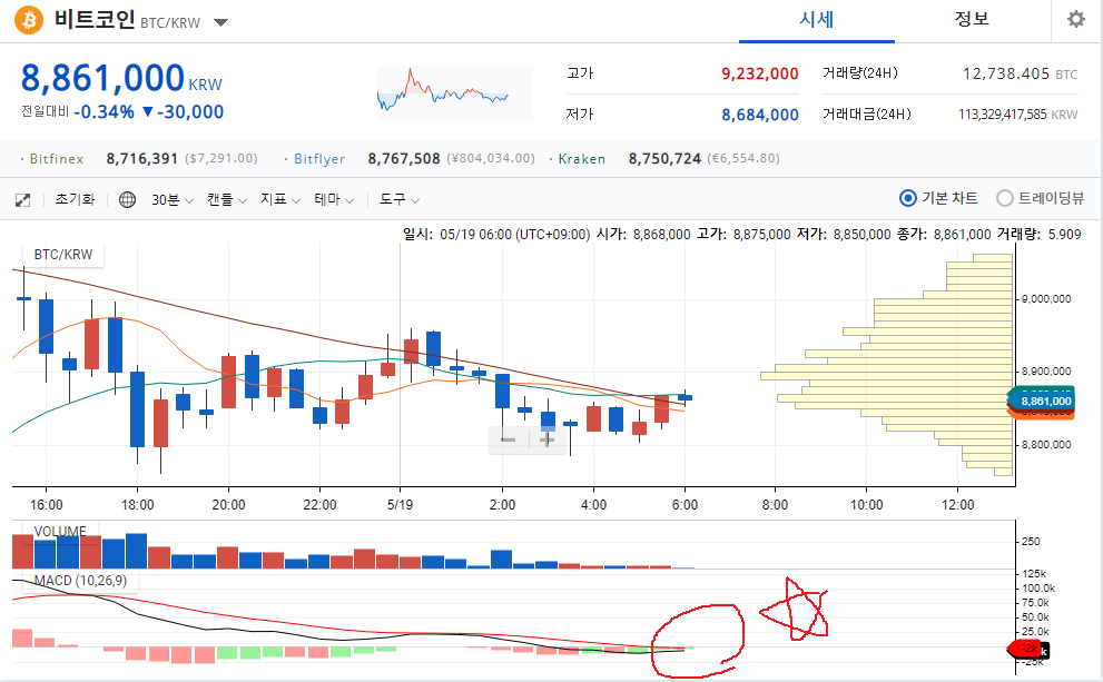 2019년 5월 19일 비트코인 차트 분석을 시작하겠습니다.