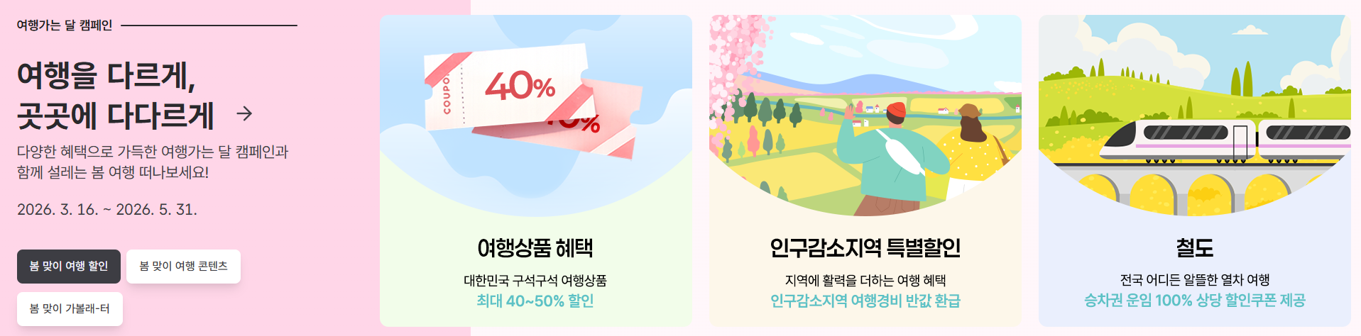 위 사이트 들어가시면 기차 할인과 인구감소 지역 여행 특별 할인이 있습니다.