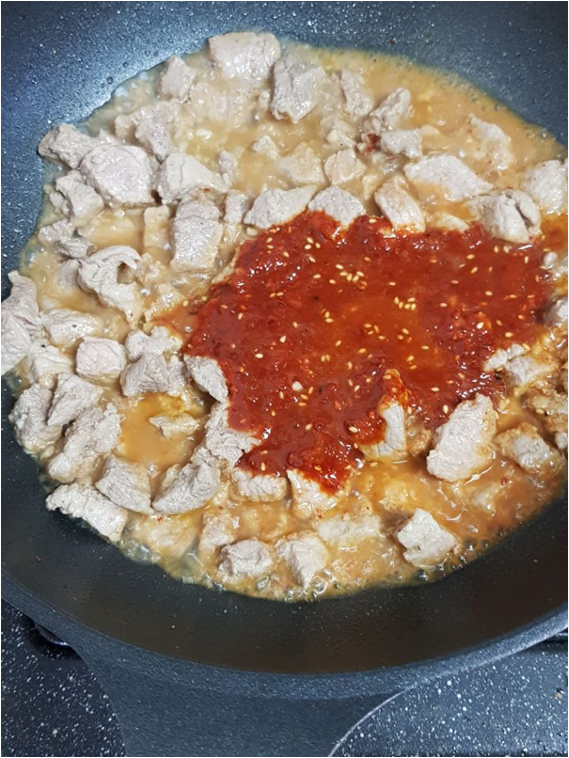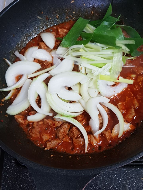 밑간한 돼지고기와 양념, 파/양파를 넣어서 잘 익혀주면 끝~:D