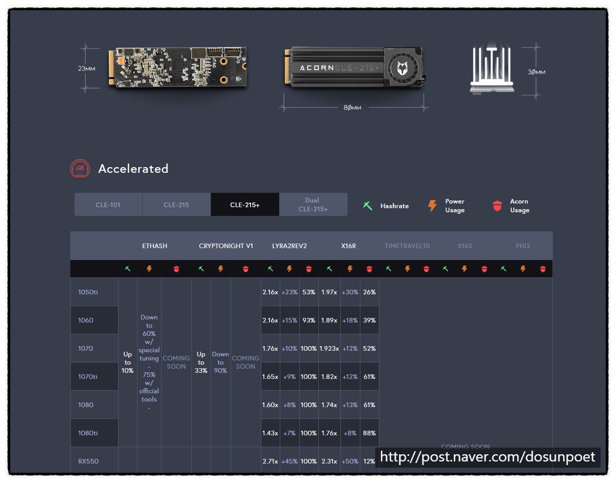Acorn CLE-215+ 라는 이름의 마이닝 가속기 카드입니다. 메인보드 M.2 슬롯에 장착하면 해당 메인보드에 장착 된 GPU들의 성능을 30% 까지 올려준다고 합니다. 거기에 개선을 더 해 전력까지 최적화하여 10%이상 낮출 수 있으며 이더해시를 기준으로 지포스1060 6way 의 경우 220 mh/s, 라데온 580 8way 의 경우 310 mh/s 가 나온다고 하니 내용대로 출시가 된다면 현재 GPU방식으로 마이닝을 돌리는 분들에게는 매우 고무적인 소식이 될 수 있을 듯 합니다.