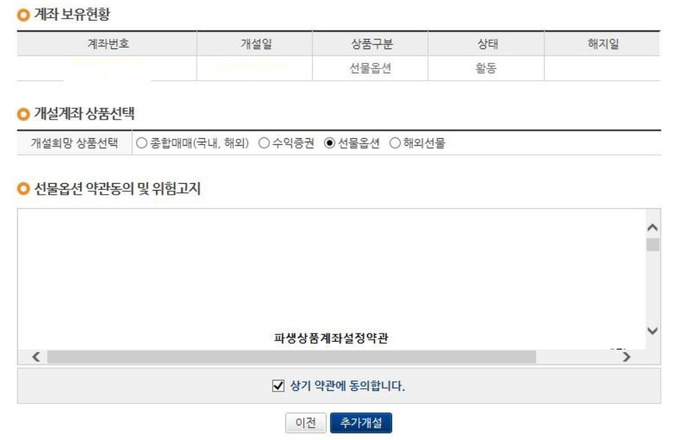 이베스트증권 추가계좌개설 HTS 7716 화면 (기존 파생계좌 있는 상태에서 추가로 파생계좌개설)
