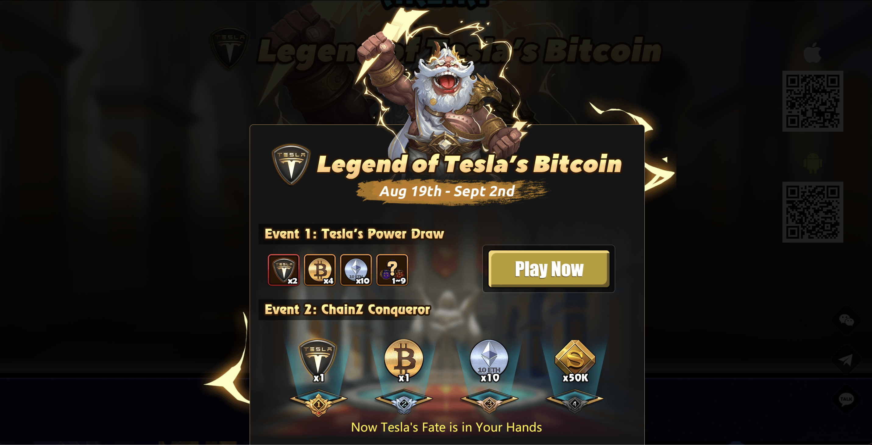 ⚔️ [체인즈 아레나]: 역대급 이벤트 테슬라, 비트코인, 이더리움 증정!