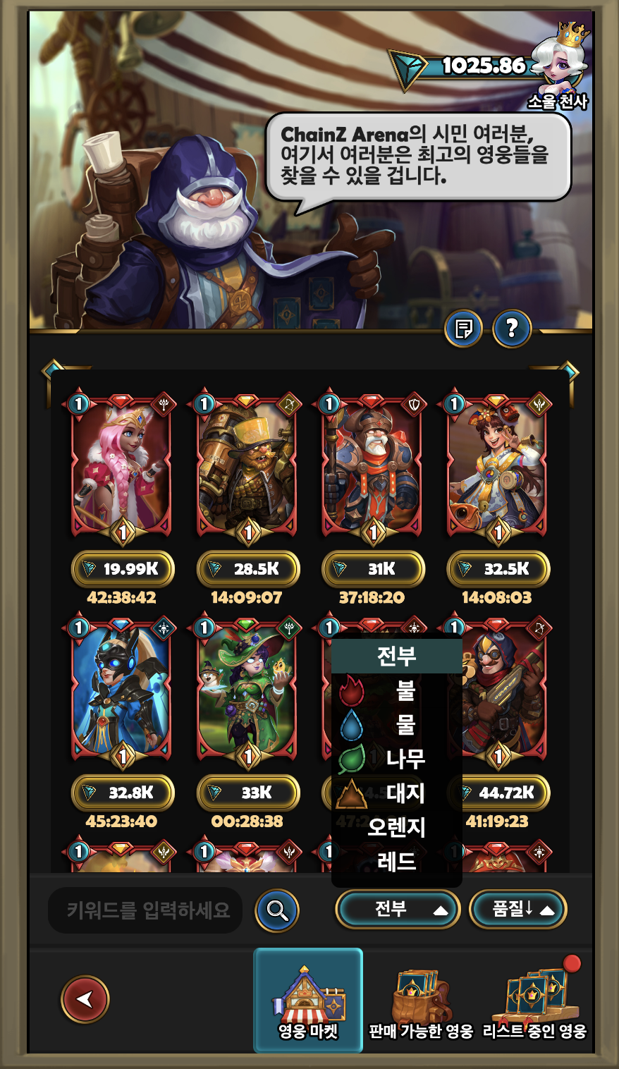 아래와 같이 여러 영웅들이 올라와 있는 걸 볼 수 있는데요.각 속성 및 레드, 오렌지 등을 기준으로 영웅들을 검색해 볼 수도있습니다. 또는, 해당 영웅들의 이름을 직접 검색할 수도 있습니다.
