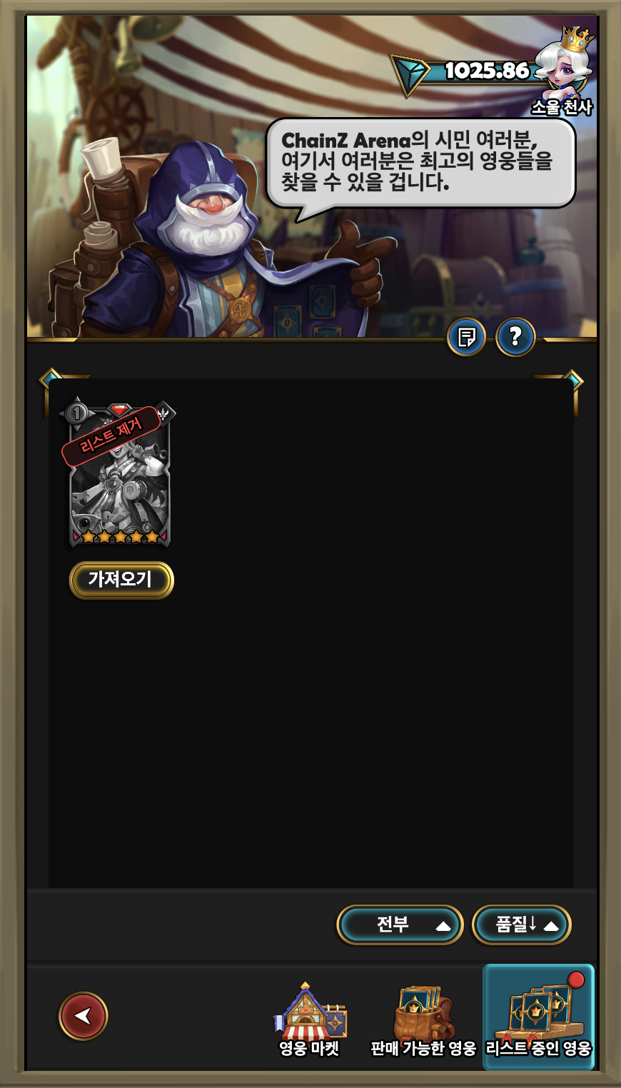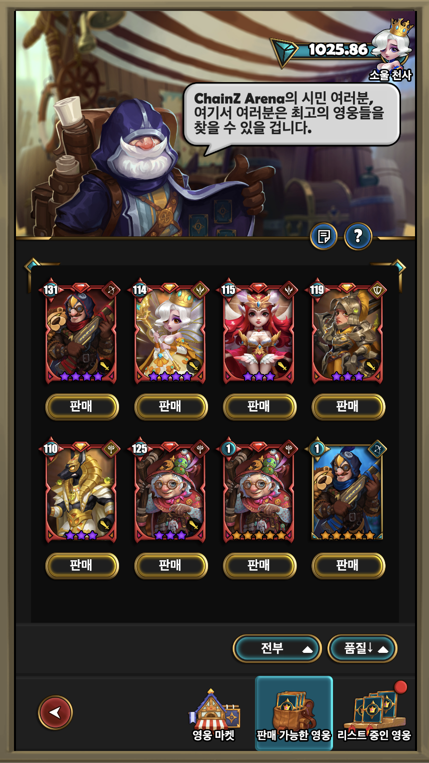 바로 옆 칸에서는 내가 보유한 영웅들을 판매할 수 있습니다. 참고로 전투 덱이나 투기장 덱에 구성되어 있는 영웅은 판매가 불가능하며, 레벨이 1보다 높은 경우에는 재단에서 초기화를 시켜야 판매할 수 있습니다.