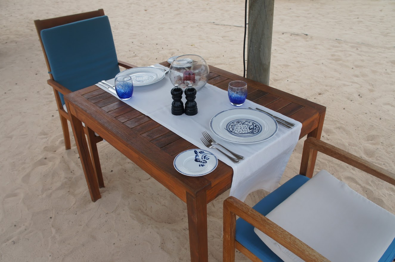 아웃리거 리조트에 허니문 디너를 위한 해변 레스토랑 식탁