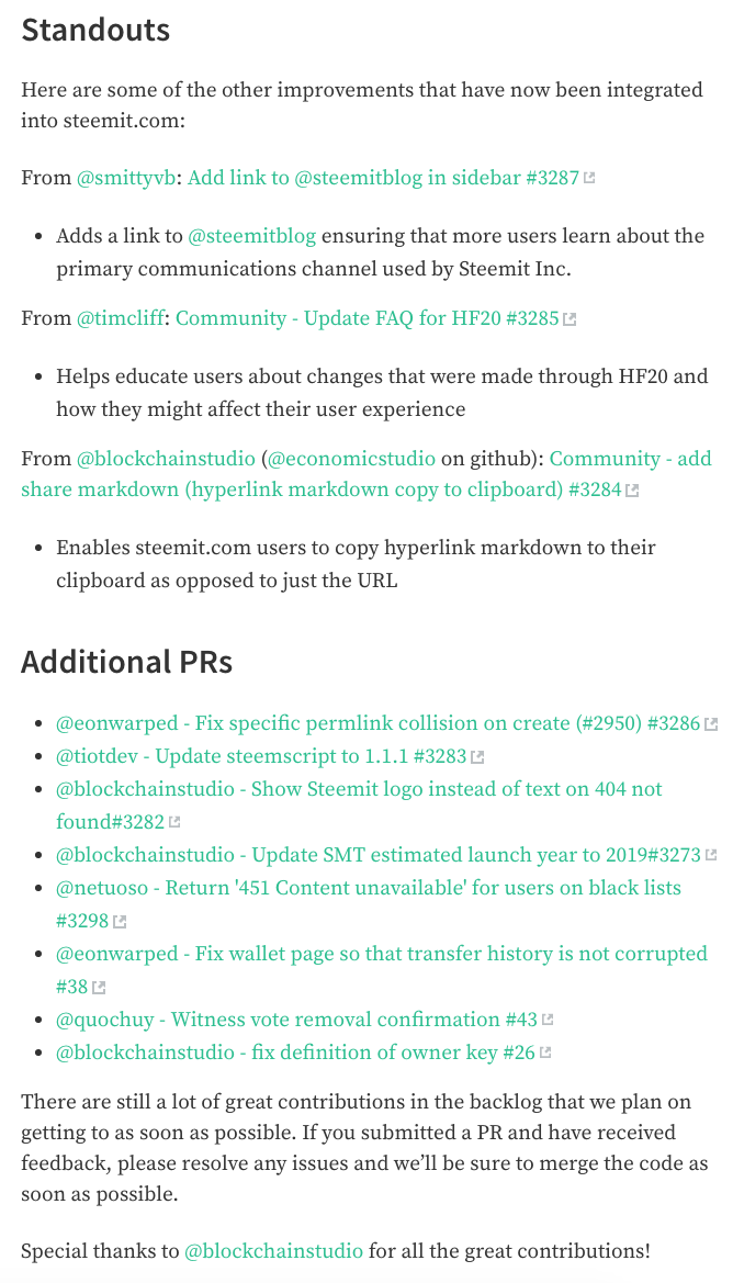 조금전 올라온 @steemitblog의 Steemit Community Contributions (D.tube Embeds!) 글에 제가 얼마전 스팀잇에 제 코드 반영 (부제: 지갑 분리가 가져온 긍정적인 변화)에서 말씀드렸던 제가 했던 일들도 소개 되었습니다. 이번에 소개된 11개 업데이트중 4개가 제가 한거라서 1/3이 넘네요^^ 그래서인지 마지막에