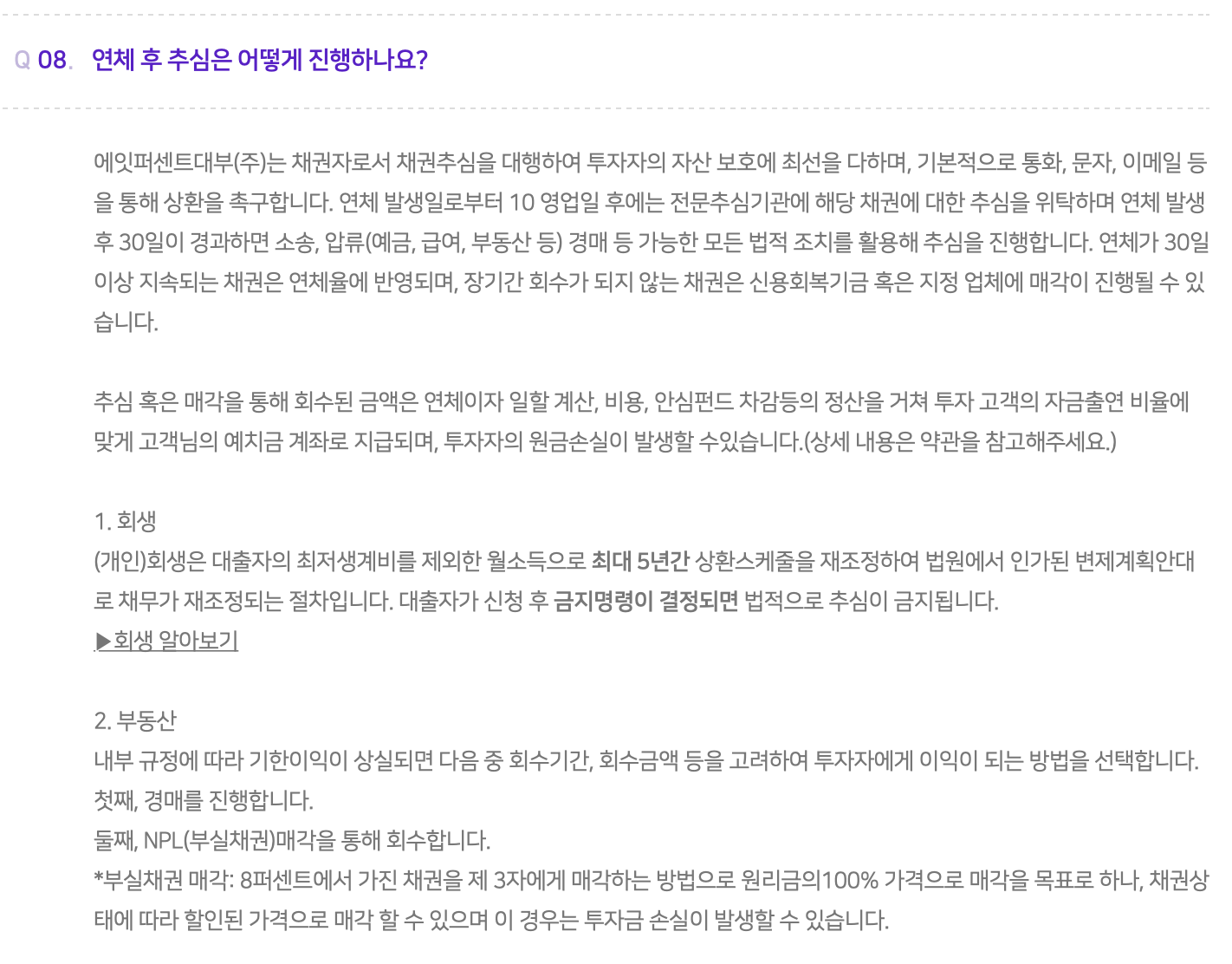 아래는 연체 후 추심관련 8퍼센트 공지사항이다.