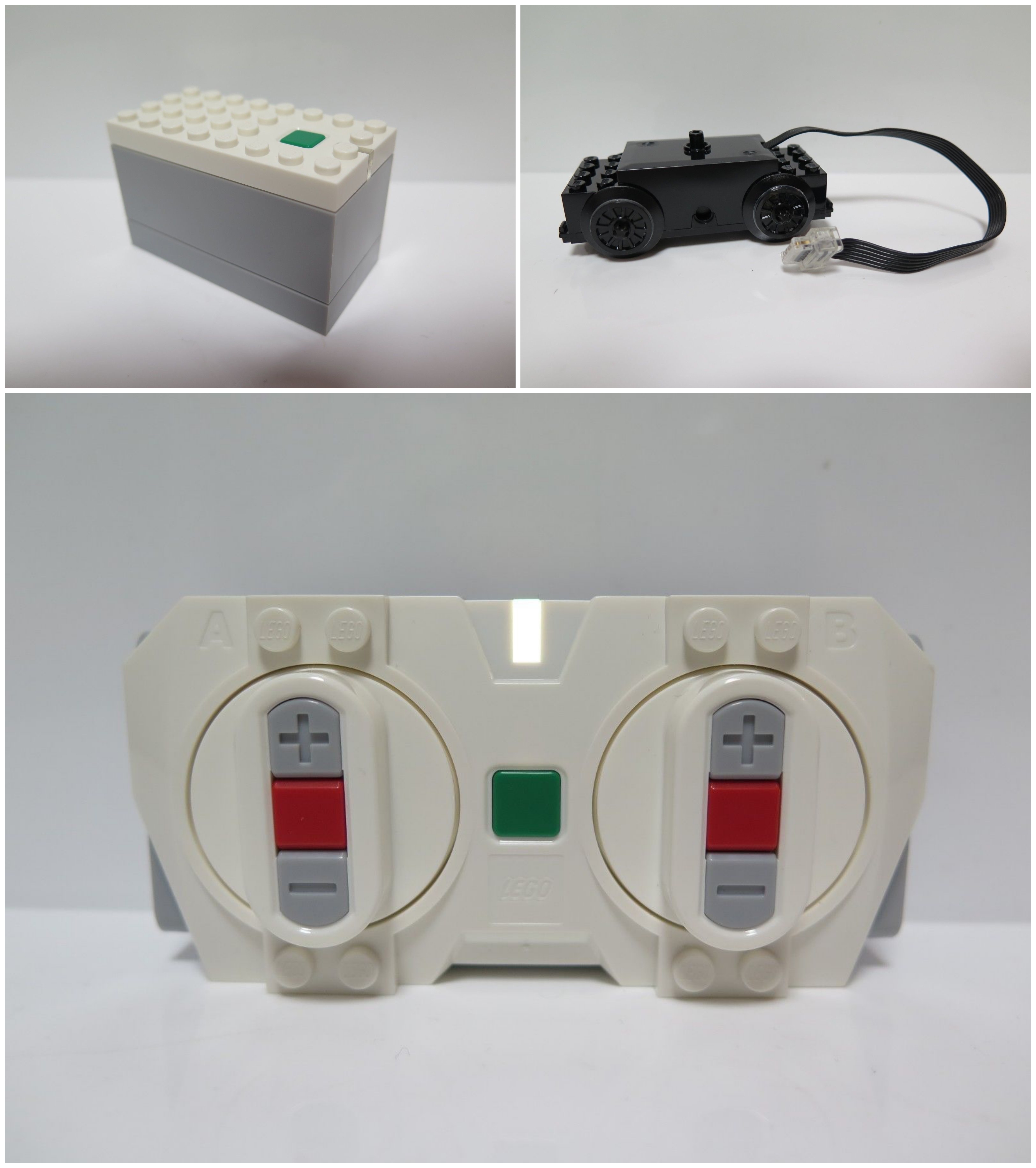 [사진 왼쪽 위부터 시계 방향으로 새로운 구동 시스템의 블루투스 Hub, 기차 모터, 리모트 콘트롤러]