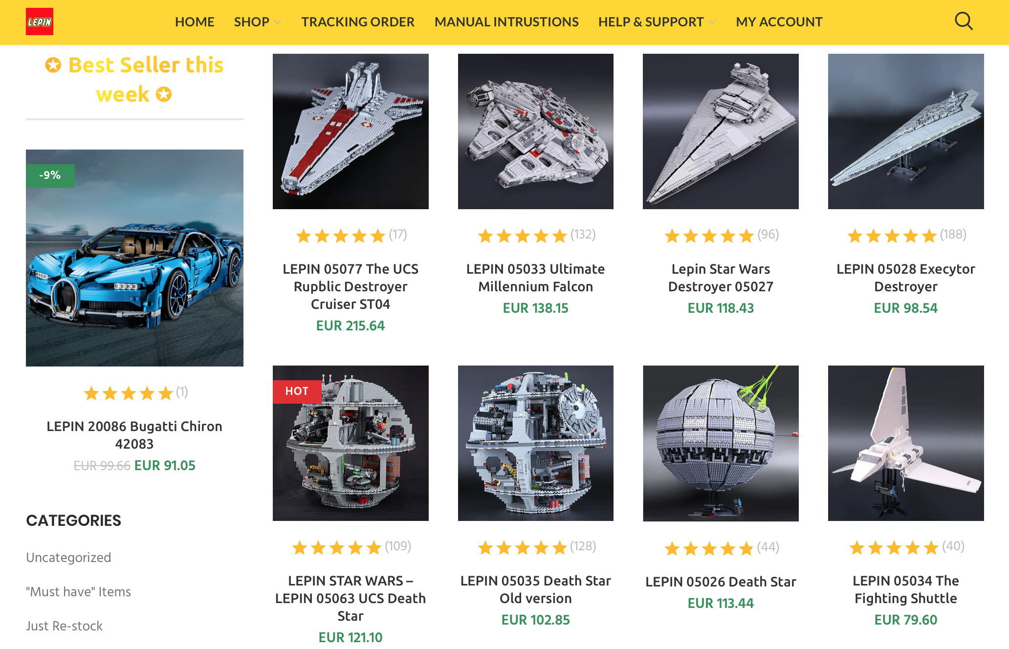 [초점을 살짝 흐리게 해서 보면 레고 공식몰을 보는 건지 짝퉁몰을 보는 건지 구분하기 힘들 정도이다. 중국의 레고 모조품 제조회사는 레고사의 제품만 베끼는 게 아니라 개인 창작가의 창작품도 무단으로 가져다 상품화해서 판매할 정도로 악질적이고 근본이 없다. 위 이미지에 보이는 스타워즈 제품 중 왼쪽 맨 위 베나터(Republic Destroyer Cruiser : 이마저도 철자가 틀려 있음)는 창작가의 창작품의 상품화한 것이다]