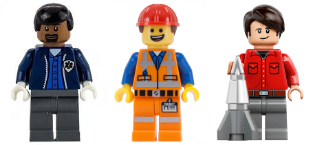 [대표적인 레고 미니피겨의 피부 색. 왼쪽부터 검은 얼굴, 노란 얼굴, 살구색 얼굴]