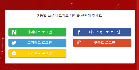 네이버, 카카오톡, 구글, 트위터, 페이스북 중 1가지로 로그인 합니다.