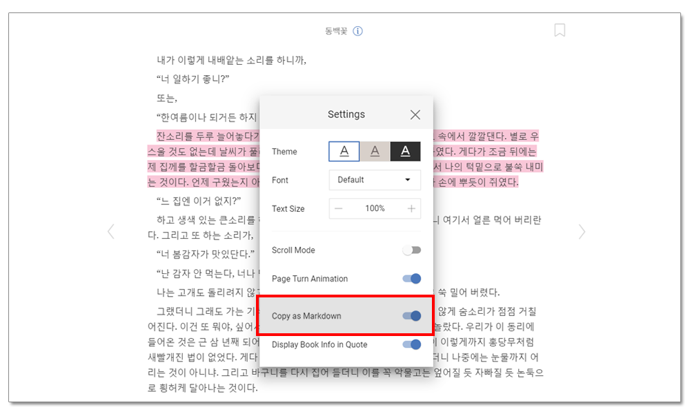 스팀잇에서 북 리뷰 글쓰기시 바로 적용할 수 있도록, 책에서 마음에 드는 문장을 마크다운 형식으로 복사 가능하도록 지원합니다. 인용구를 글쓰기에 넣게되면, 인용문구의 링크를 통해 해당 페이지를 공유할 수 있습니다. 편하게 책보고, 북리뷰를 쉽게 작성하고, 다른 사람들과 좋은 생각을 공유해보세요.