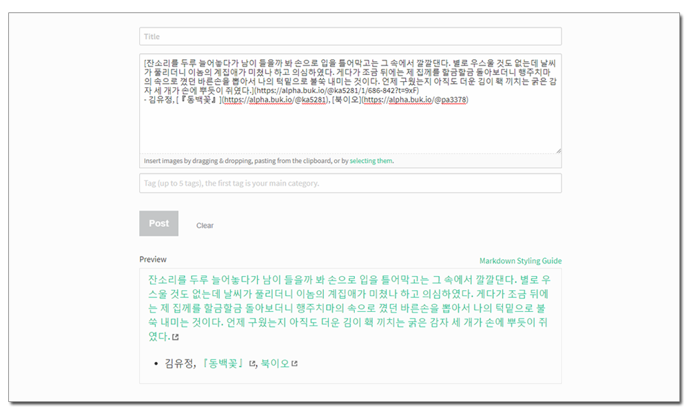스팀잇 글쓰기에서 Ctrl+v 를 눌러붙여넣기 하면, 이미지와 같은 형태로 마음에 드는 문구가 복사됩니다.