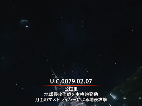 U.C. 0079년 02월 01일, 지온 공국은 본격적인 지구 침략을 위해 지구방면군의 설립을 공표합니다. 자비 가의 막내아들인 '가르마 자비'가 사령관으로 취임합니다. 6일 후인 02월 07일, '지구침공작전'을 본격적으로 발동합니다. 달 표면의 '매스드라이버'에 의한 지표면공격으로 지상의 대공 방어망이 무력화되어 지온군이 강하하기 좋은 환경이 만들어지죠.
