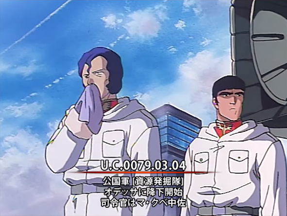 U.C. 0079년 03월 01일, 드디어 지온 공국의 '제1차 지구침공작전'이 시작됩니다. 연방군의 바이코눌 우주기지에 '키시리아 자비'가 이끄는 우주기지 제압부대가 강하합니다. 중동 및 유럽 방면에 전선을 구축해 진군합니다. 다음 날인 03월 02일 정오, 지구강하부대 제 1진에 의해 지구의 거대 거점 중 하나였던 '오데사'와 그 주변 공업지대가 제압됩니다. 그리고 03월 04일에는 '키시리아 자비'의 심복인 '마 쿠베'를 중심으로 한 지온 공국군 자원채굴부대가 오데사에 진입합니다.