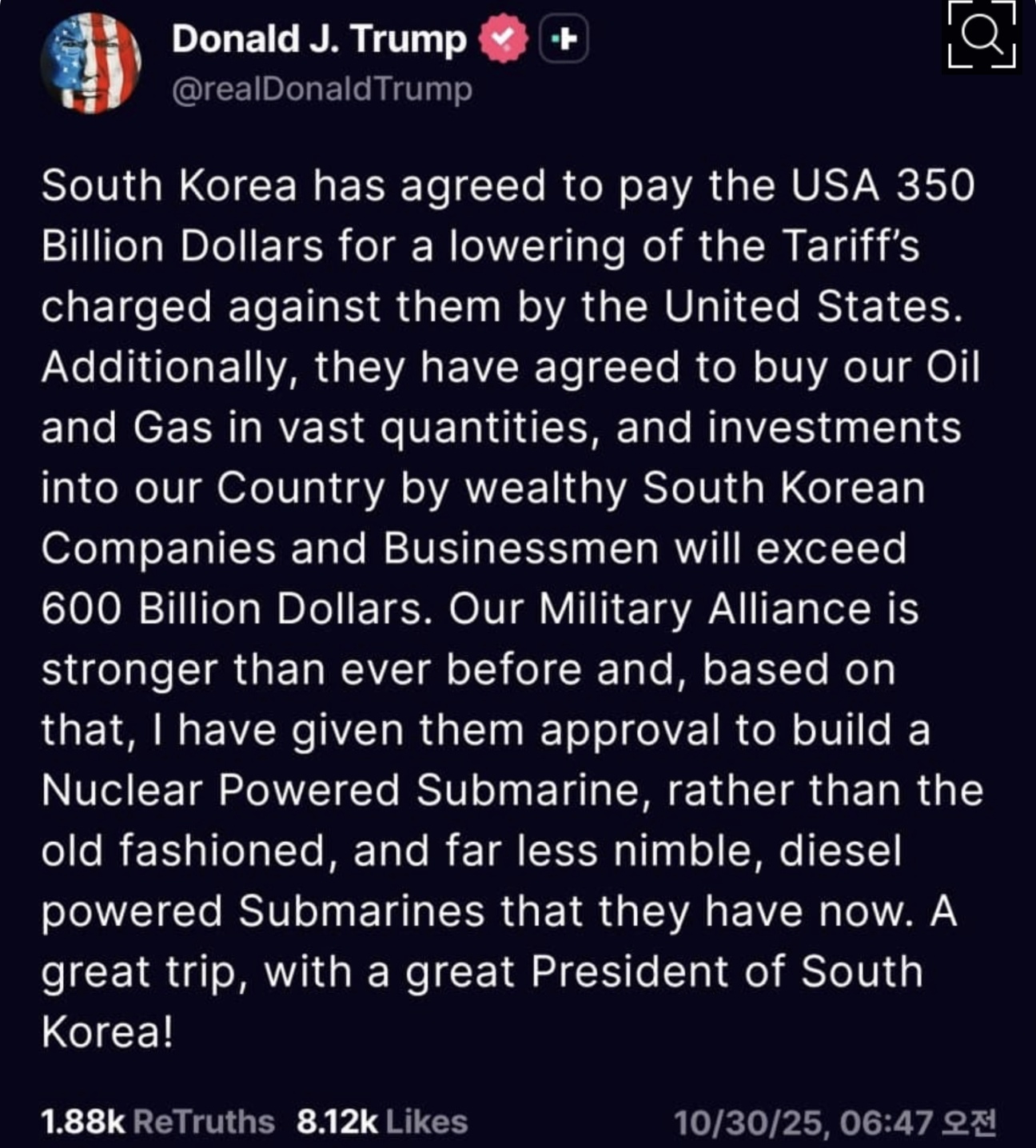 폭스비즈니스는 10월 29일자 기사에서 “Trump hails $950B South Korea deal, gives nod to nuclear-powered submarines(트럼프, 9500억 달러 규모의 한국 협상 환영…핵추진 잠수함 건조 승인)”이라는 제목으로 트럼프 대통령의 트루스소셜 게시글 내용을 상세히 소개했다. 해당 게시글에서 트럼프 대통령은 “한국은 미국이 부과하던 관세를 낮추는 조건으로 3500억 달러를 지불하기로 했으며, 미국산 석유와 가스를 대량 구매하고, 한국 기업들의 미국 내 투자는 6000억 달러를 초과할 것”이라고 주장했다.