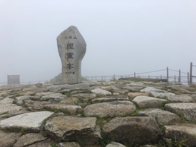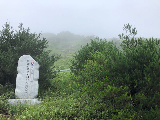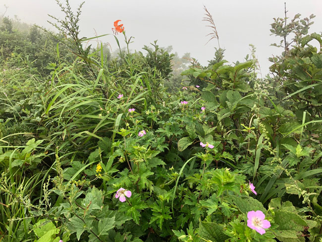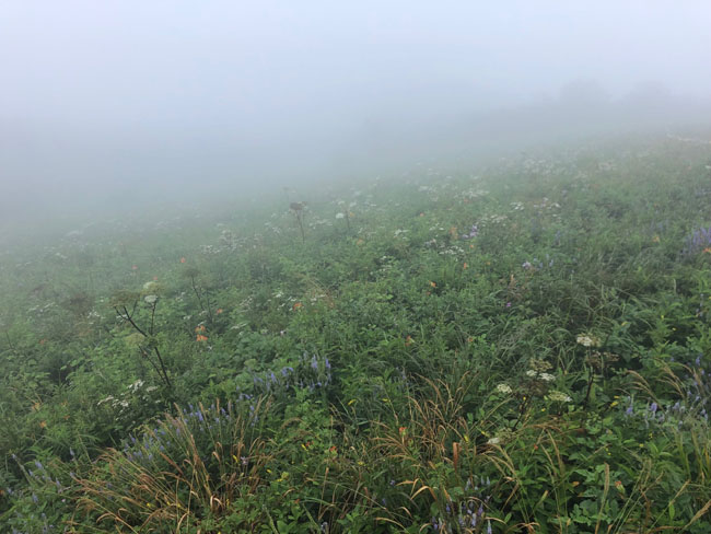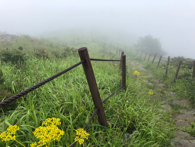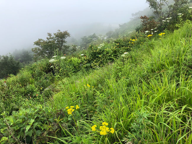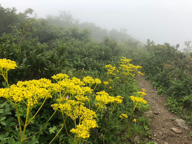 연화봉 정상(1,376m)에 이르자, 다행히 비는 잦아들었다. 하지만 운무는 여전히 걷힐 기미를 보이지 않는다. 잠시 배낭을 내려 숨을 고르며 사방을 응시했다. 가까이 야생화만 또렷이 눈에 들어왔다. 지천이 야생화로 뒤덮힌 여름 소백은 앙칼진 겨울 소백의 매력 못지않다.
