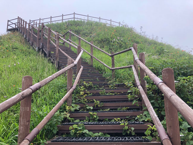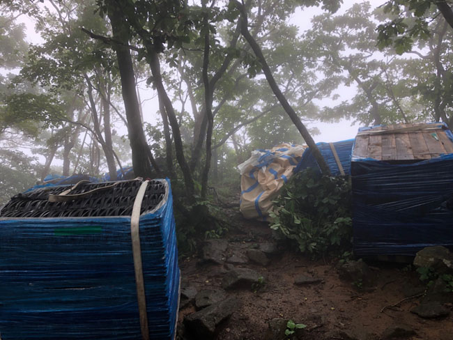 길가로 웃자란 풀숲을 헤치고, 미끄덩대는 너덜길을 조심조심 빠져나오니 제1연화봉을 오르는 계단이 막아선다. 고갤 들어 올려다 봤다. 그 끝은 안개에 묻혀 가늠되지 않으나 여러번 다녀본 길이라 감은 온다. 저기만 올라서면 비로봉까지 업다운이 심하지 않다. 아직은 멀쩡해 보이는 목계단인데 발판 교체를 할 모양인가? 제1연화봉까지, 목자재가 담긴 포대들이 어지러이 놓여 있다.