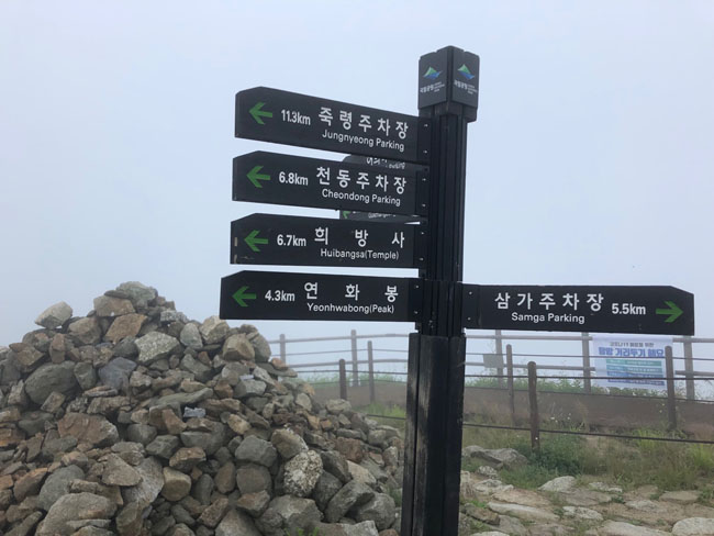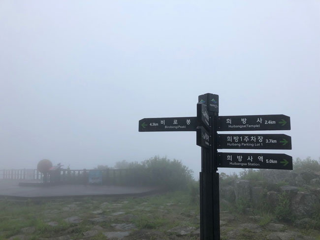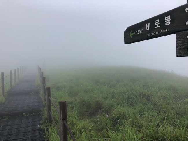 비로봉이 가까울수록 운무는 점점 더 짙어졌다. 월요일의 소백산, 그야말로 적막강산이다. 그래도 비로봉인데 너댓명은 있겠지 했다. 웬걸~ 텅텅 비었다. 주말이면 정상석을 배경으로 인증샷 대기줄이 장난 아닌데,,, 텅 빈 비로봉의 모습이 도무지 낯설다.
