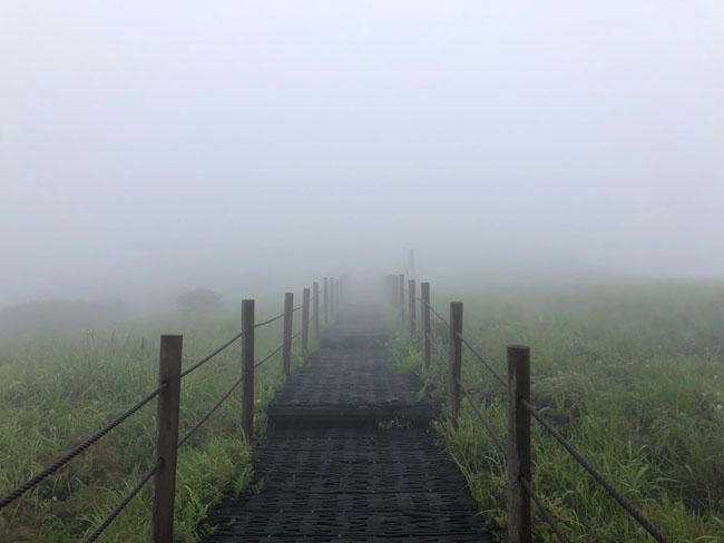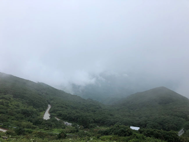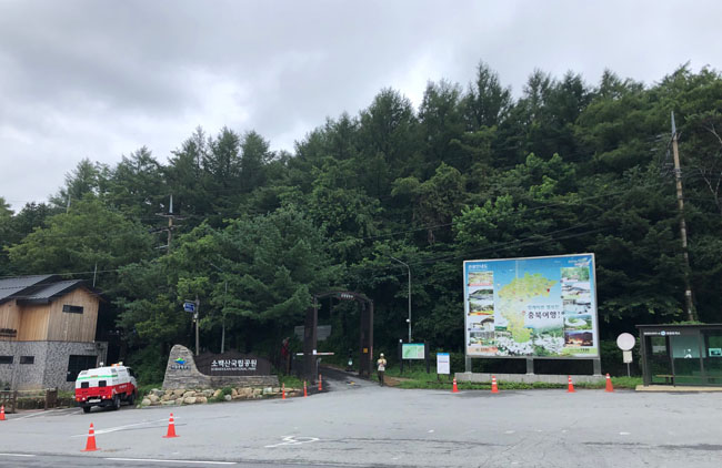 죽령탐방지원센터(해발 689m)를 들머리로 걸음을 시작했다. 연화봉(해발 1,335m)까지는 7.1km, 표고차는 666m, 시멘트로 포장된 완만한 길이다. 물론 이 콘크리트 임도는 일반 차량은 출입할 수 없다. 국립공원관리공단 차량과 소백산 천문대 차량만 오갈 수 있다. 산객들은 한쪽 가장자리에 깔아놓은 야자매트를 따라 걸어 오르면 된다. 야자매트는 물기를 머금고 있어 축축하다. 무덥고 습하기가 생각 그 이상이다. '땀이 난다'가 아니라 숫제 '줄줄 샌다'가 맞다. 땀내 맡고 죽기 살기로 달려드는 풀모기의 극성도 감내해야만 한다. 이 모두를 즐길 수 있어야 비로소 '山'이 보일 터인데, 아직은 내공의 깊이가 얕다. 짙은 안개 속 오롯이 나 혼자다.