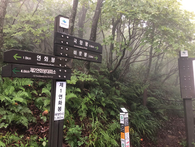 연화봉에서 제1연화봉까지는 울울창창 숲길이다. 햇볕 쨍쨍한 날이었다면 더없이 걷기 좋은 그늘 구간이겠으나 오늘처럼 숲안개 자욱한 날은 더욱 어둑해 '전설의 고향' 분위기만 물씬, 으스스 하다.