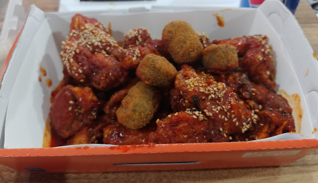 양념치킨의 소스맛을 옅게 한 후 묵은지 김치를 희석시켜서 섞은 맛..