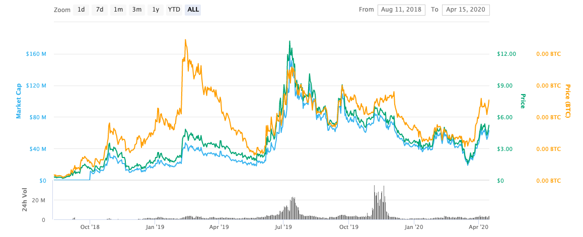사상 최고 가격은 2019년 7월 8일 코인이 $ 15.77에 도달 한 시점입니다. 그런 다음 가격이 점차 내려 가기 시작했습니다. 그러나 가장 높은 포인트 이후에는 그래프에 일부 가격 피크가 있습니다. 2020년 3월, 코인 가격이 상승하기 시작했으며 이제 QNT 토큰 하나의 가격은 $ 5.22입니다.