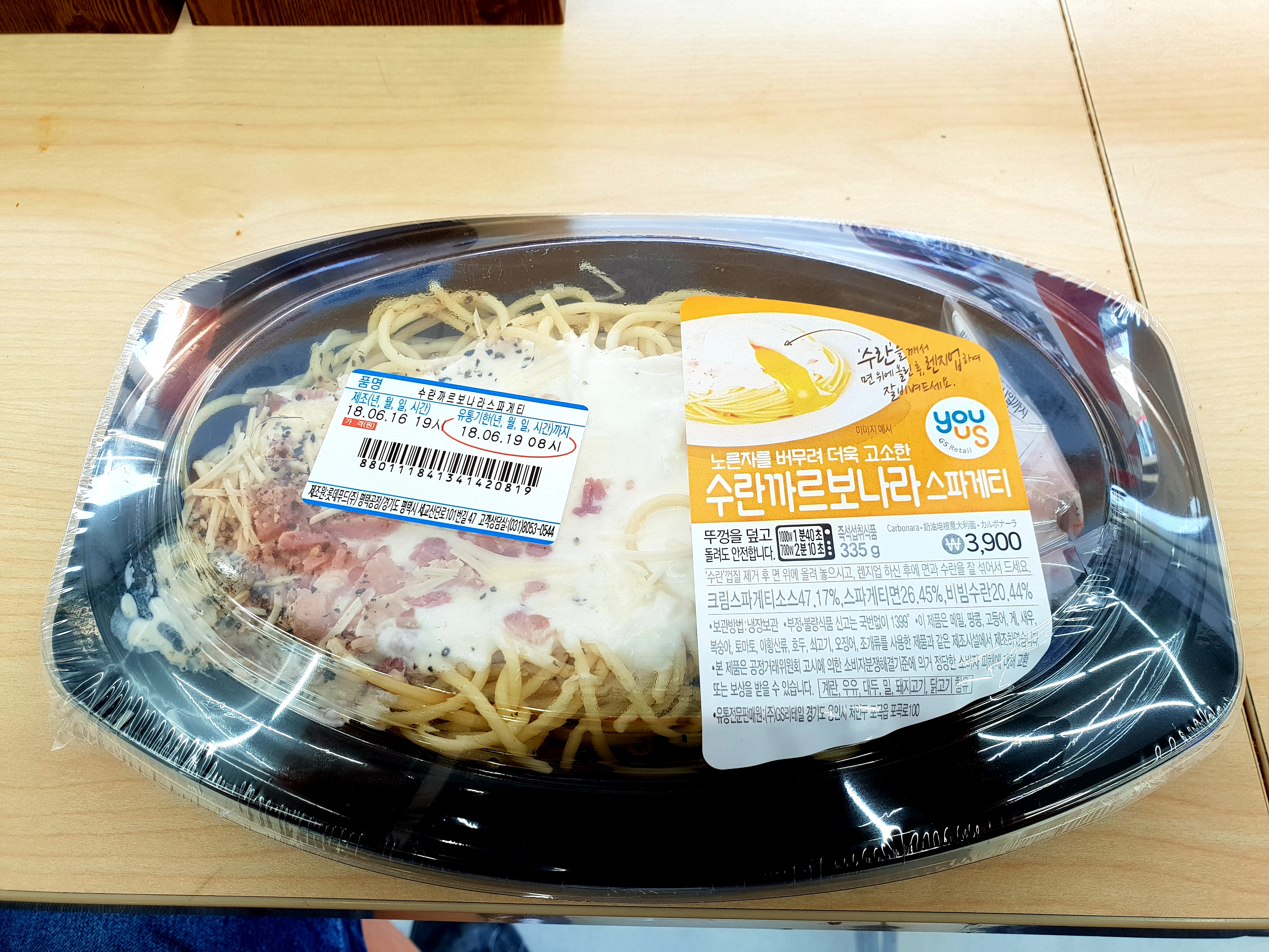 오늘은 gs25에 도시락 중에 있는 노른자를 버무려더욱 고소한 수란까르보나라 스파게티를 리뷰해볼거예요. 가격은 3900원이에요!!