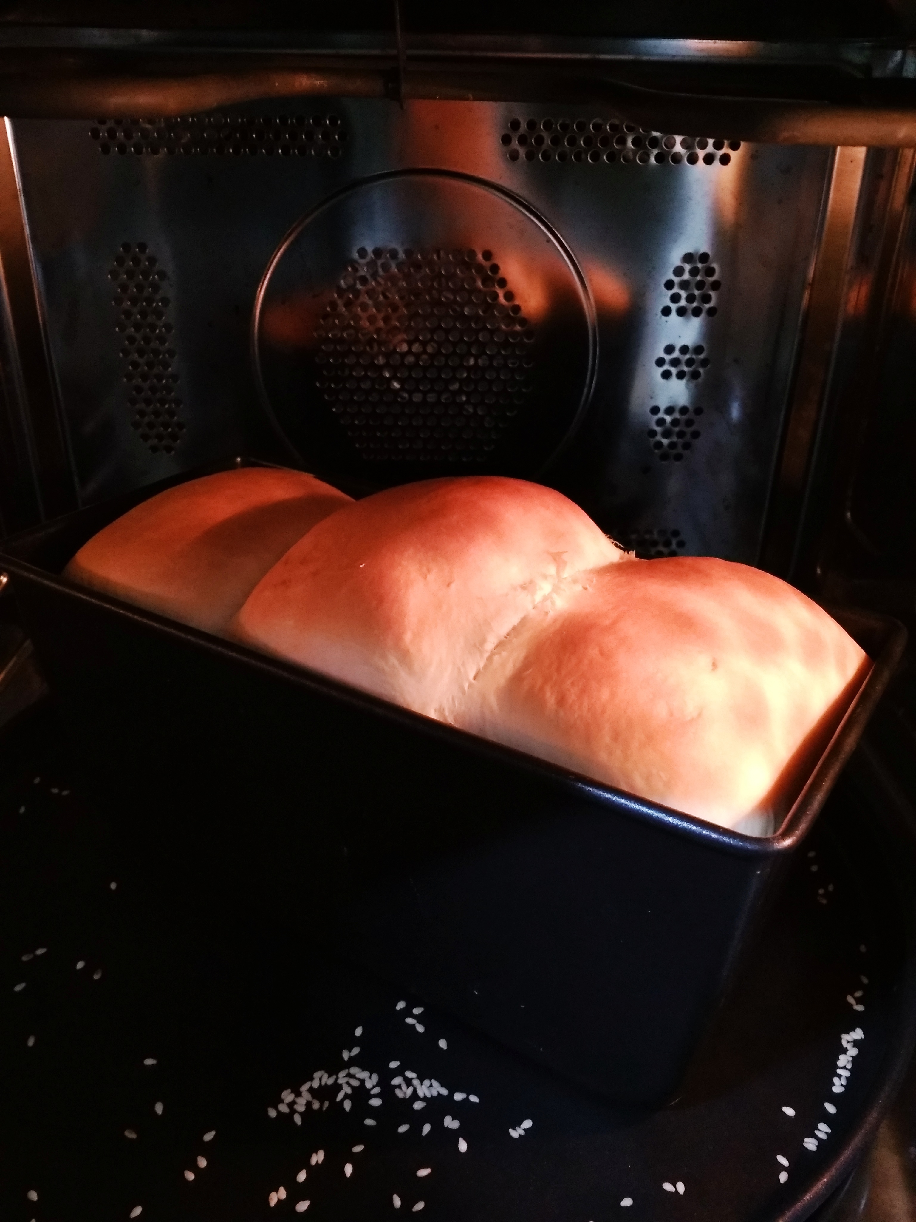 우유식빵도 1차발효, 중간발효, 성형 및 2차 발효를 마치고 굽기까지 완료했다(오븐팬에 깨알같이 떨어진 참깨ㅋㅋㅋㅋ통밀빵의 잔재들ㅋㅋㅋ)