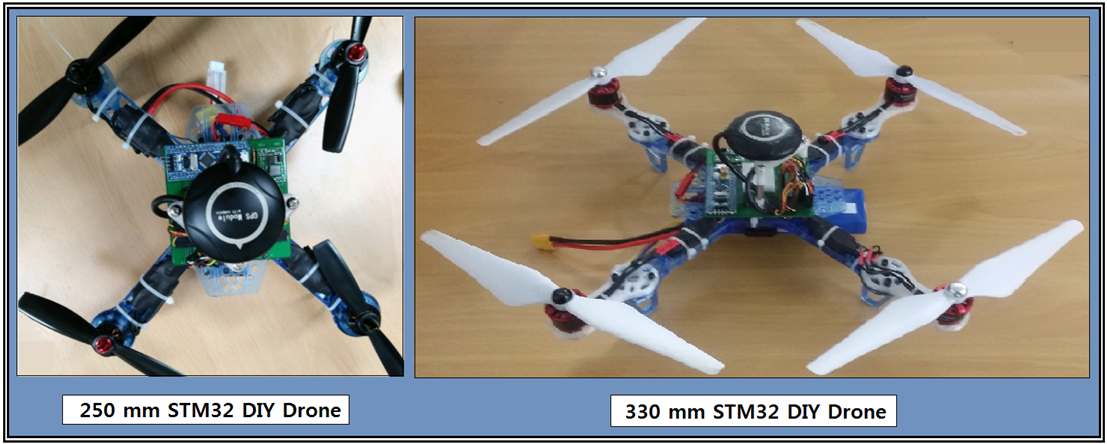 한편 동호회 멤버들도 코드 수정이 가능한 Brokking 의 오픈 소스를 모델로 하여 최근에는 32비트 마이크로 콘트롤러인 STM32 PCB 를 제작하여 다음과 같은 Variant 드론 모델을 제작하여 시험하고 있다. 330mm STM32 DIY 드론은 250 mm 드론 기체에 3D 프린팅에 의해 확장용 부품을 출력하여 조립하고 추진 모터는 아예 450mm 기체용을 사용하여 기동성이 뛰어난 일종의 고출력형 드론 개조를 목표로 하고 있다. 비행제어 코드는 Brokking 의 코드를 그대로 사용해도 되며 자신이 있으면 부분적으로 코드를 수정할 수도 있다.