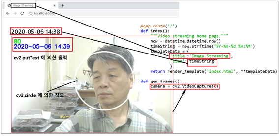 아래 그림을 참조하면 윈도우즈 PC 의 아나콘다에서 안면 인식에 소요되는 시간이 녹색 80 밀리 초임을 알 수 있다. 특히 ‘title’로 출력된 timeString 시간은 웹서버 시작 초기에 한번 출력되며 한편 gen_frame() 루틴 내에서 cv2.VideoCapture(0) 화면에 더하여 loop 과정에서 체크하는 안면 인식 결과 원을 cv2.circle 명령에 의해 작도함과 아울러 안면인식 소요 시간 및 timeString을 cv2.putText 명령을 사용하여 출력한 결과를 추가한 최종 이미지 즉 image를 웹 출력한 것이다.