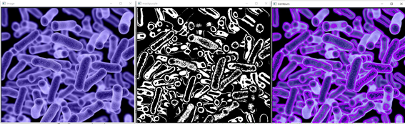 보라색상이 강한 세균 이미지를 보라색 HUE 필터링 후 이로부터 Contour 명령을 사용하여 개개의 세균 이미지를 출력해보자. 아직은 수많은 종류의 세균을 대상으로 하는 imagenet 과 같은 오픈 소스 데이터 베이스가 없으므로 HUE 필터링과 같은 기법 사용이 필요해 보인다.