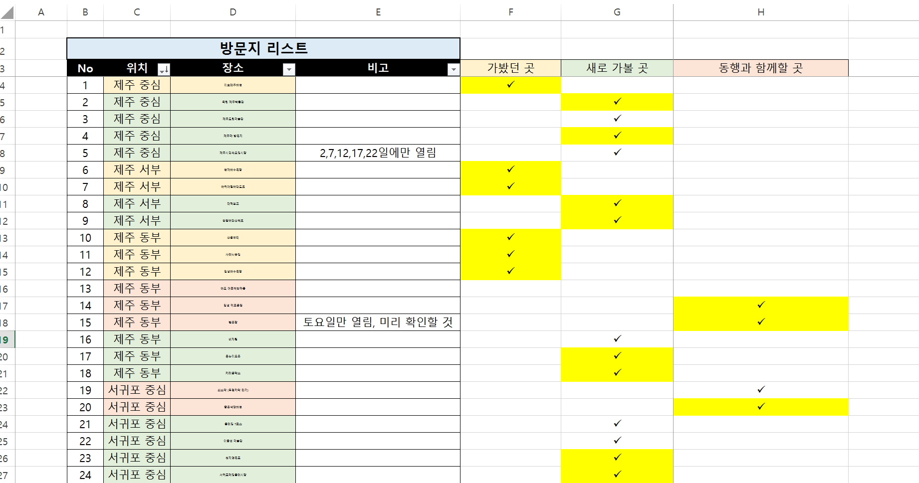 기간이 기간이다 보니 짐을 챙기는데도 문서작업을 거치지 않을 수 없었다. 물론 깜빡한 물건은 현지에서 사기 쉬운 게 국내여행의 장점이긴 하다만, 어디까지나 예산의 낭비를 막기 위해서라도 준비물은 비교적 꼼꼼하게 챙기는 게 좋다. 일단 챙길 것들을 쫙 써놓으면 가방을 꾸릴 때도 훨씬 수월하다. 캡처한 엑셀 이미지는 출발 전날 저녁의 마지막 화면인데, 노란색이 가방에 넣고 체크한 물품들이다. 자세히 보면 몇 군데 이가 빠져있는데, 몇 가지쯤이야 이따가 다시 챙겨야지 라고 생각하고는 그대로 가방을 닫았다가, 출발일 아침에 집을 나선 후에야 퍼뜩 생각이 나서 다시 돌아가서 넣었던 기억이다. 이왕 할 거면 완벽하게 끝내야 뒤탈이 없다는 걸 알면서도 여전히 대충주의가 좀 있는 편이다 나는.