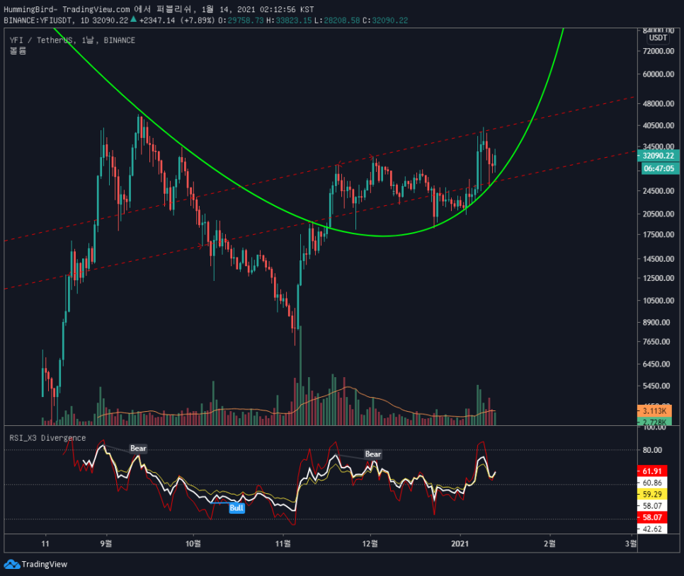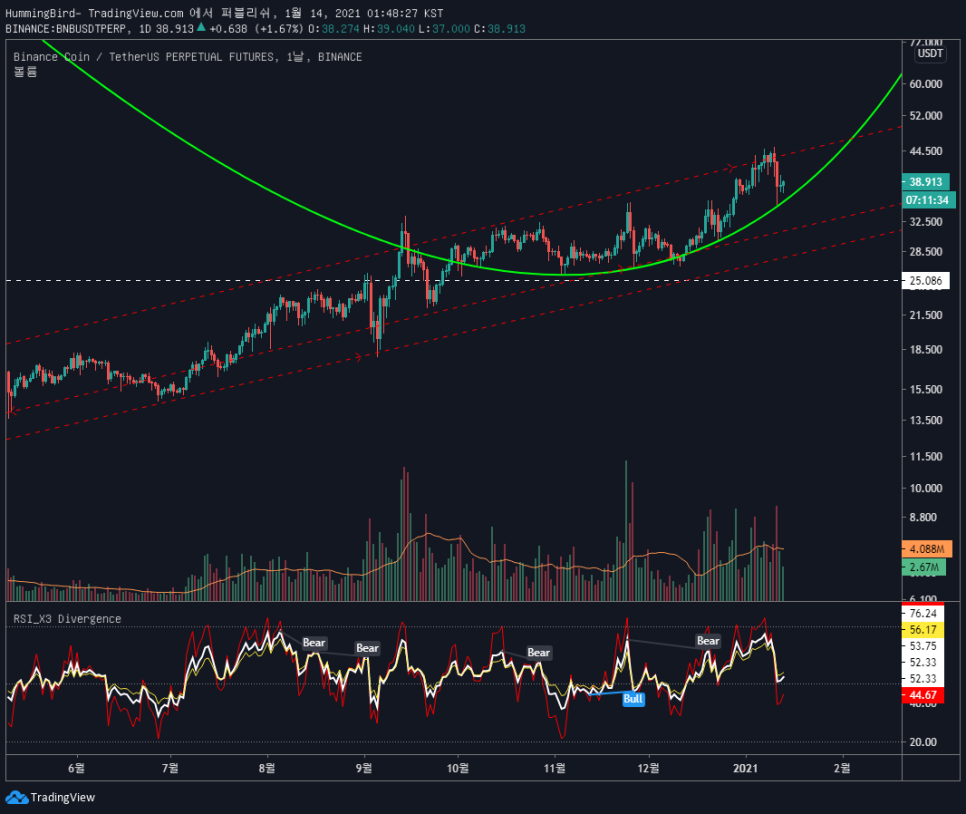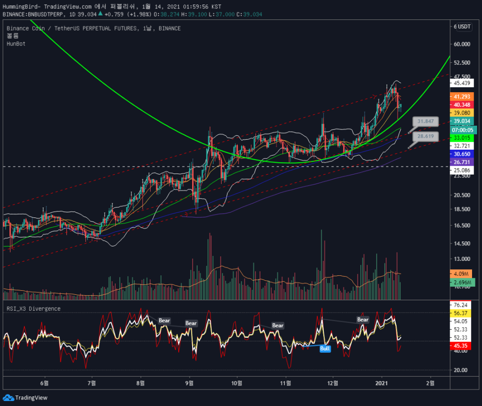 만약에 곡선이 깨진다면 왕 상승채널 +120선(파랑), 200선(보라)에서 분할매수해 나가는 식으로 접근했을 때 상승 기댓값이 클 뿐만 아니라