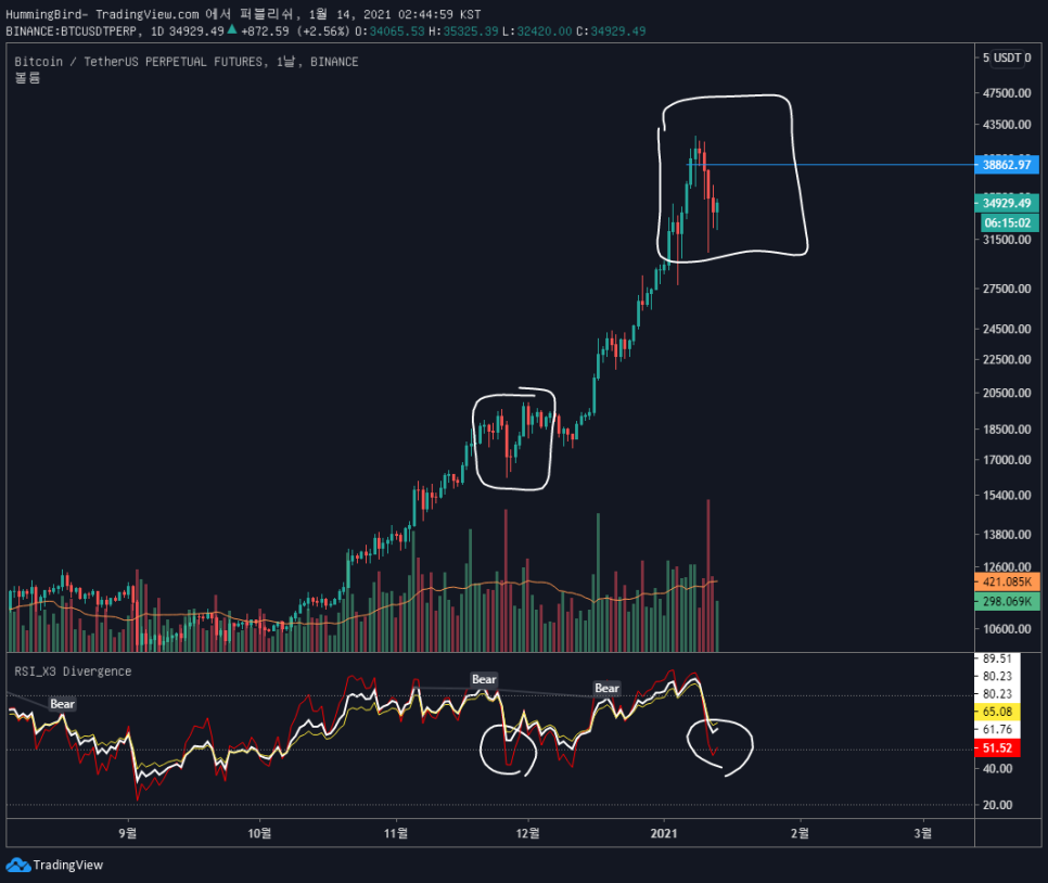 파멸적인 상승 이후 인상깊은 조정 형태를 보여주는 중