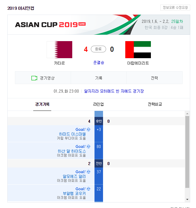 카타르가 4강에서 이기면서 결승은 일본vs카타르가 되었네요.