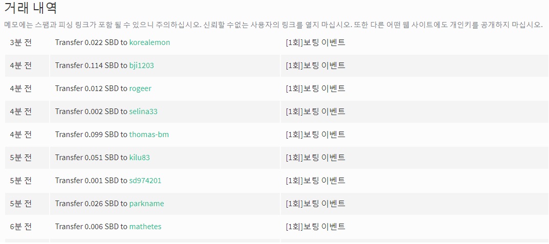 위의 결과에 따라 0.001 SBD 이상 지급 대상분들께 송금한 내역입니다.