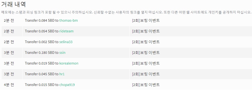 위의 결과에 따라 0.001 SBD 이상 지급 대상분들께 송금한 내역입니다.
